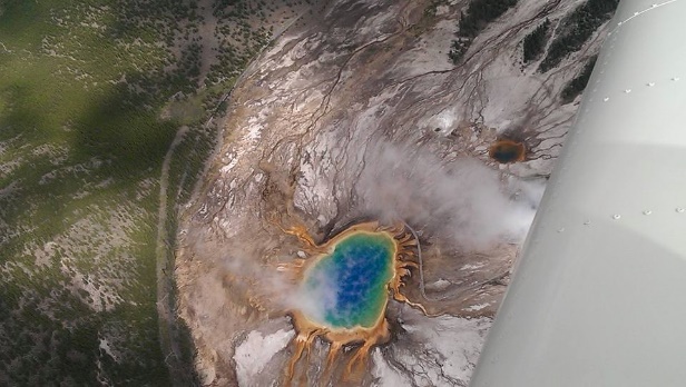 The next day was about a choices… As the weather was fair we choose the fly the shorter, challenging route. After having an EGT problem which I quickly sorted we got out of Yellowstone. We firstly flew across the park to get some great pictures of the Grand Prismatic Spring (below). We continued across the park and o