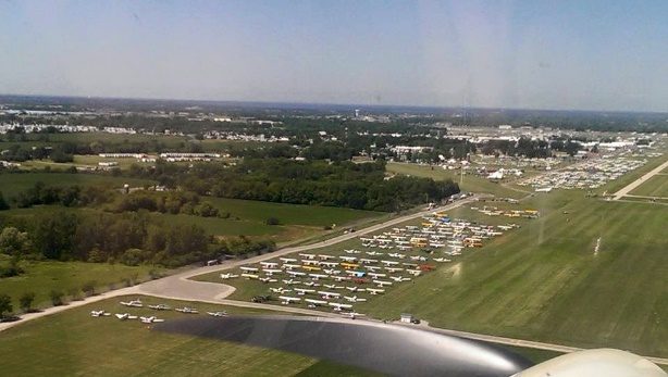 We got out early to make the most of some calmer weather but on walkaround we had another problem. The rudder has a big crease across it. It seems that when the FBO towed it into the hangar the strong wind forced the udder across to hit the stop so hard that the rudder skin creased. After straightening it out as best as possible and then checked to make sure it had no restriction, all was good so off we headed with a job to add to the next annual. We headed off in the search for more Mogas. Our first stop was Waseca MN, but neither us nor the airport the other pilots could make the MOGAs pump work so it was back to the 100LL. We then headed off to our staging point for Oshkosh the small airport of Portage WI. We had planned to stay locally overnight but after a fair tailwind and a rocky landing we decided to grab a break, fuel up and then head for ‘The Big one’