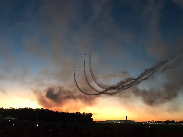 The Night air show was spectacular with close formation aerobatics from a trio of Harvards with pyrotechnics, a night glider aerobatic display and a parachute drop at night by the Navy Seals with flares.